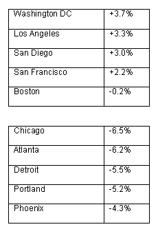 Geographic pockets of strength or weakness are typically a function of local economics, inventories and demographics. We're starting to see more differentiation when diving into the numbers across the country. The S&P/Case-Shiller Home Price Indices were recently released, with data through October 2010. They include a 20-city composite of metropolitan areas, and in terms of the one-year percentage change, here are the top and bottom five regions: